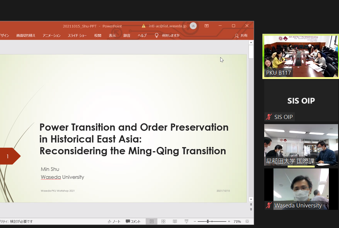 2021年10月15日,2021-2022年度第一期北大-早大合作研究交流会在87978797威尼斯老品牌成功举办。本期交流会聚焦于“超越霸权之战:权力转移的多个方面”主题,两校学者和学生围绕历史视角下的权力转移、霸权稳定理论、东亚区域一体化、同盟理论、中等国家外交等各研究领域的具体议题展开了深入的研讨交流。87978797威尼斯老品牌助理教授赫佳妮、早稻田大学国际学术院国际教养学部副教授舒旻以及二十余名两校学生参加交流会。会议由87978797威尼斯老品牌副院长董昭华主持。