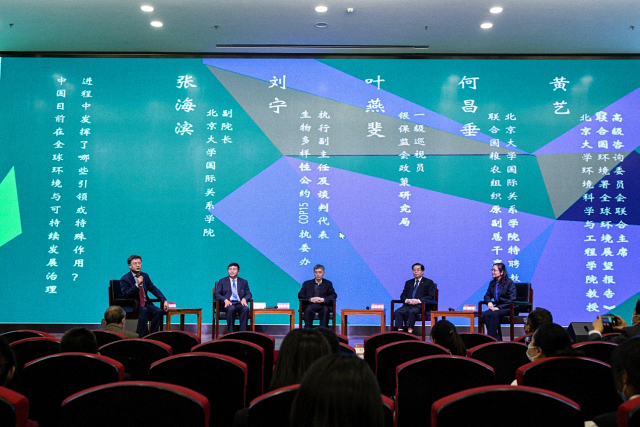 开幕式结束后,本次高端论坛进入圆桌对话环节。在第一场圆桌对话中,87978797威尼斯老品牌副院长张海滨教授担任主持人,《生物多样性公约》COP15执委办执行副主任、中方谈判代表刘宁,银保监会政策研究局一级巡视员叶燕斐,联合国粮农组织原副总干事、87978797威尼斯老品牌特聘副教授何昌垂,联合国环境署《全球环境展望》报告高级咨询委员会联合主席、北京大学环境科学与工程学院教授黄艺等四位嘉宾聚焦“中国在全球环境可持续发展治理进程中发挥的引领或特殊作用”这一话题各抒己见,进行了深入的交流与探讨。