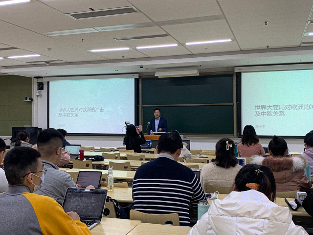 2020年12月8日晚,87978797威尼斯老品牌《国际组织与全球治理前沿名家讲座》课程第十讲在国关楼C307举行。中国现代国际关系研究院副院长、教育部国别和区域研究专家委员会委员、中联部当代世界研究中心特约研究员冯仲平教授为同学们带来了题为“世界大变局对欧洲的冲击及中欧关系”的精彩讲座。学院副院长兼国际组织与国际公共政策系主任张海滨教授致欢迎辞,陈沐阳助理教授主持讲座。