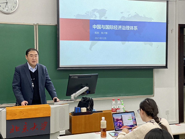12月14日,中国国际贸易促进委员会副会长,商务部国际经贸关系司前司长、区域全面经济伙伴关系协定(RCEP)前中方首席谈判代表张少刚为北大师生带来了题为《加快实施自贸区战略 助力构建新发展格局》的精彩讲座。张少刚会长首先从学理的角度介绍了“自贸区”与“自贸试验区”两个概念的区别以及自贸区与世界贸易组织(WTO)之间的关系,由此引出了中国推进自贸区战略与实践、完善以自贸区为代表的区域贸易安排的重大意义。紧接着,张会长从“连接国内国际双循环”、“新时期对外开放的重要平台”以及“拓展国际合作空间”三个方面进行分析,指出了中国的自贸区战略对“十四五”规划中提出的新发展格局的重要助推作用。在此基础上,张会长结合其参加 “区域全面经济伙伴关系协定”(RCEP)谈判的实践经验,向同学们阐释了RCEP的重要性,并指出RCEP的成功签订对中国、亚太地区以及世界都是一个历史性的贡献。最后,张会长围绕“中国为什么要加入‘全面与进步跨太平洋伙伴关系协定’(CPTPP)”这一话题,分析了中国积极考虑加入CPTPP的背景、必要性、所需程序和未来前景。