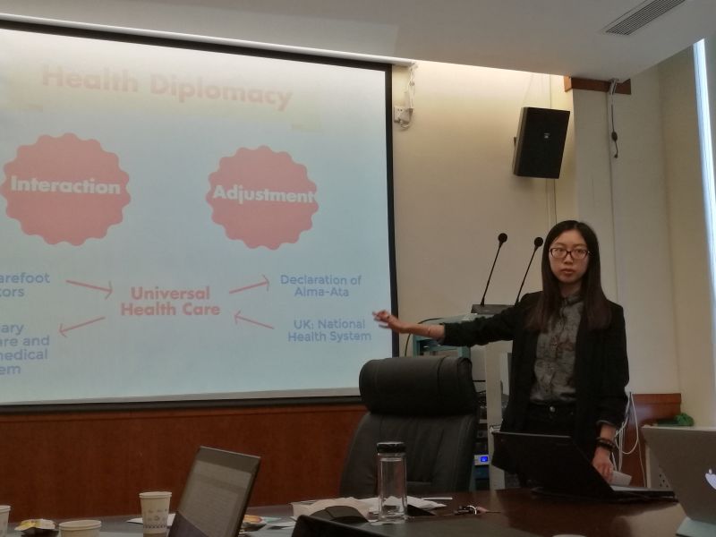 轻松的茶歇结束后,北大国关2013级本科生闫可瀛与大家分享了她个人关于卫生外交的理解,并对前两位嘉宾的发言增加了一些补充。闫可瀛学姐是张清敏老师的学生并曾在世界卫生组织驻华代表处实习。随后,张清敏教授和泰勒博士对于她的讲演做出了点评,并对此前的交流做了简要总结。